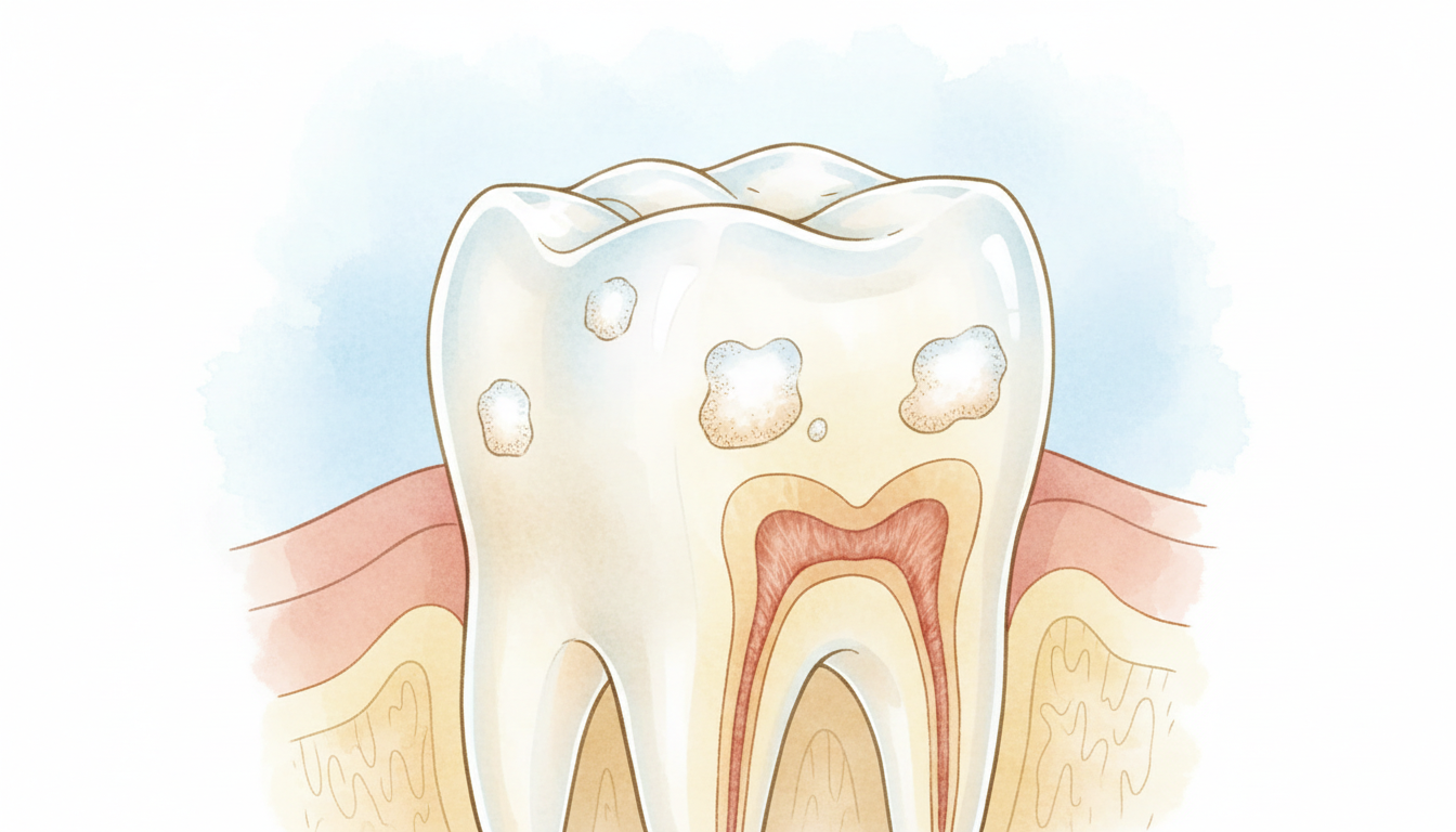 虫歯は、口の中の細菌が作り出す「酸」によって歯が溶かされていく病気です。初期段階では歯の表面のエナメル質が溶け始め、進行すると内側の象牙質にまで穴が開いていきます。